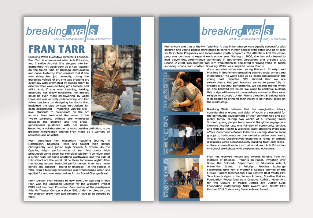 This project involved creating impactful visual materials for Breaking Walls, a nonprofit organization empowering youth worldwide through the arts. It included designing an engaging infographic to showcase the organization's core values, as well as developing a series of digital adverts. Additionally, the project encompassed crafting a two-pager highlighting the founder's story and vision. The goal was to visually communicate the organization's mission and inspire support for its cause.