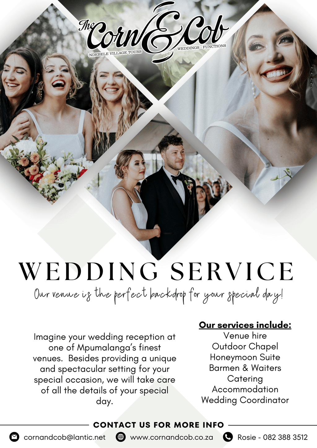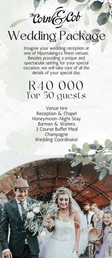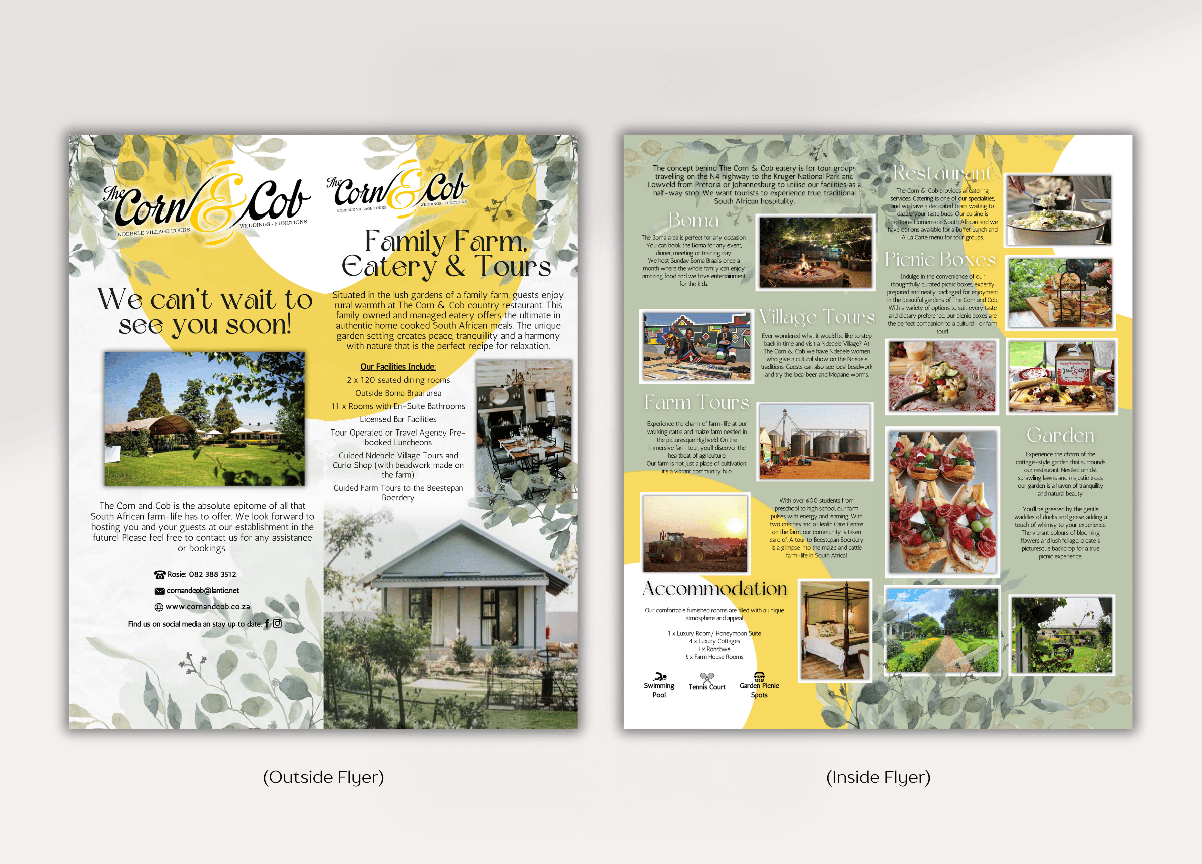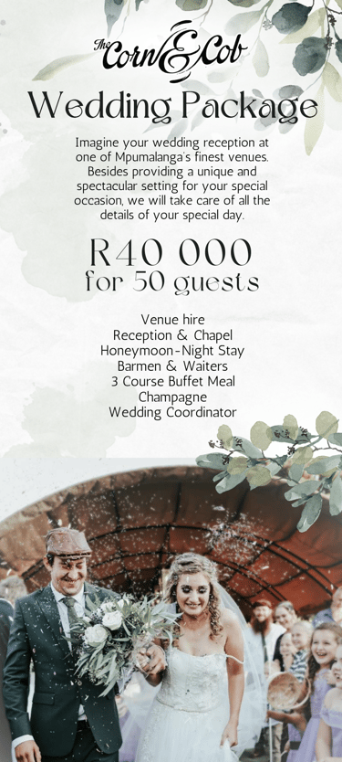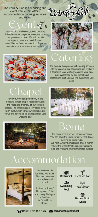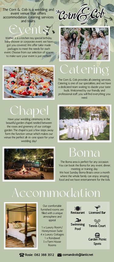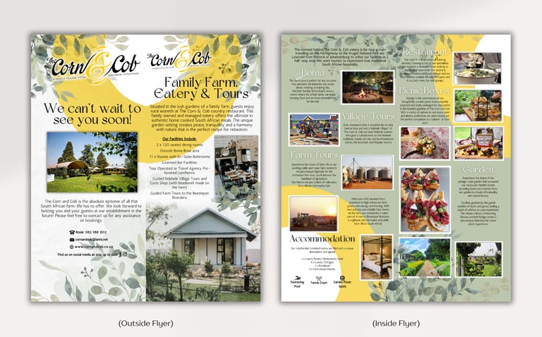 The project involved creating visually appealing flyers and a reusable poster to promote the Corn & Cob, a wedding and events venue. The Corn & Cob offers a charming setting with comprehensive services including venue hire, catering, and accommodation. The promotional materials were designed to highlight these features, attracting couples and event planners to choose the Corn & Cob for their special occasions. A second flyer was designed with tour guides and travel agents in mind in order to attract them to the venue for tours and catering services.